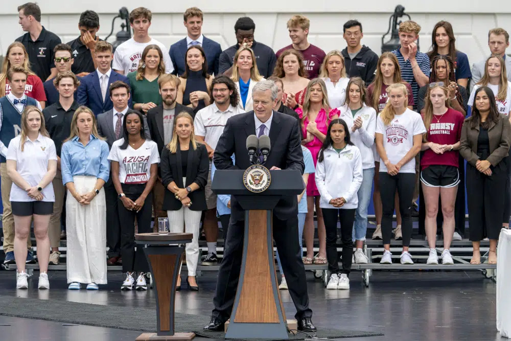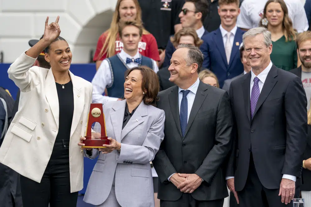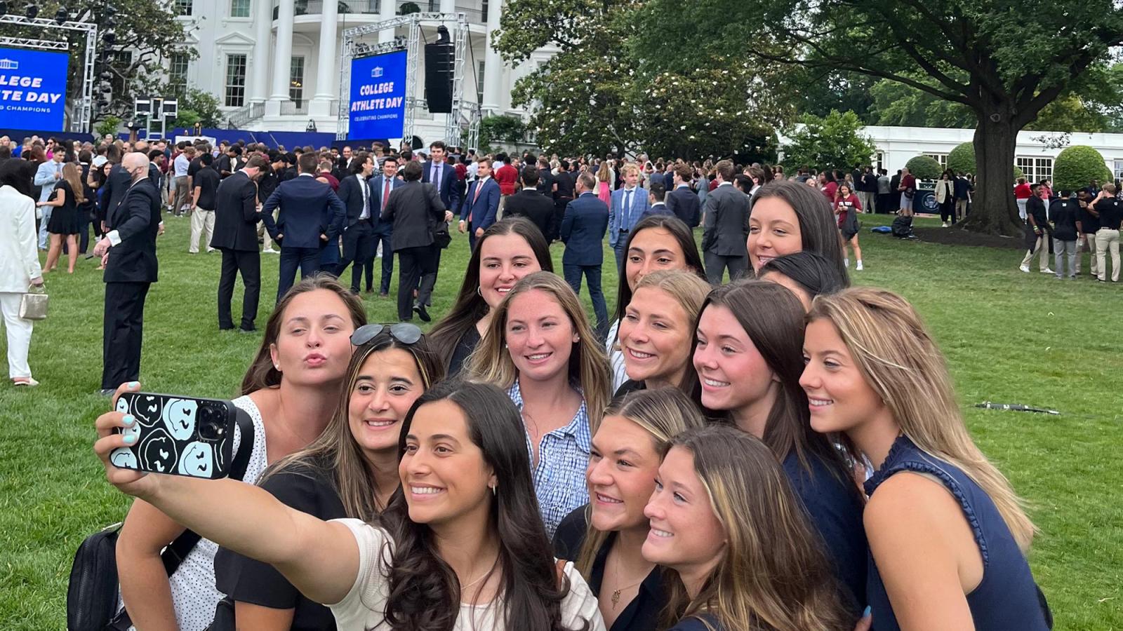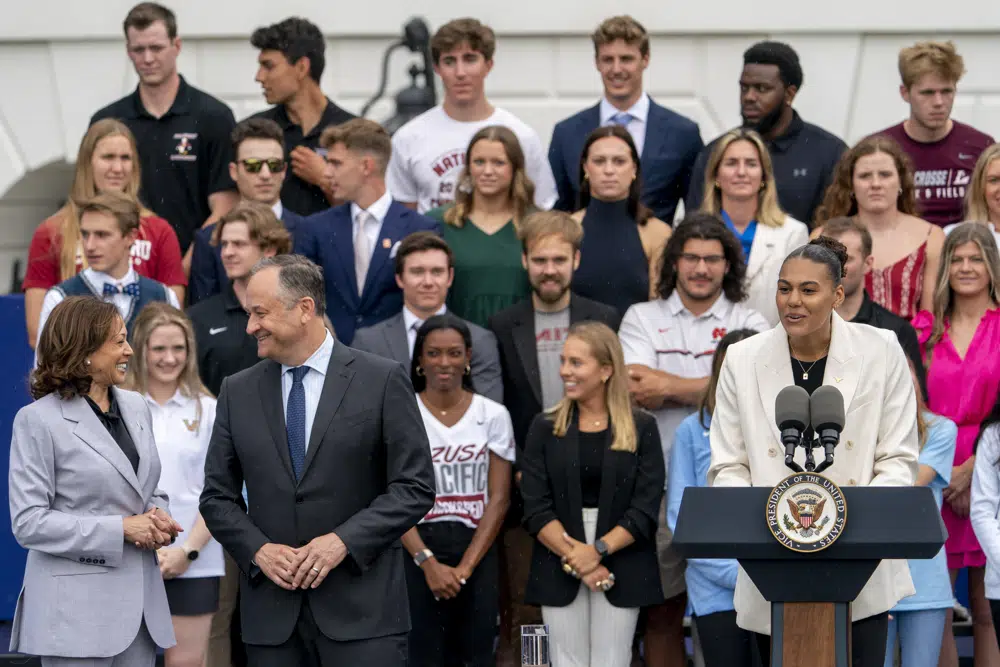 More than a thousand collegiate athletes from winning teams in the United States gathered on the South Lawn of the White House on Monday. Vice President Kamala Harris praised them and noted that athletics had a "very special way of bringing people together."