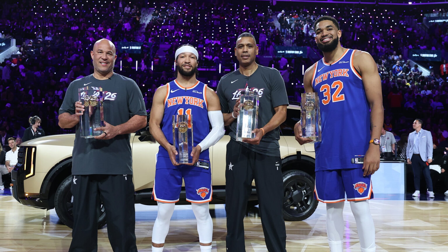 Team Knicks: New York Knicks teammates Jalen Brunson and Karl-Anthony Towns, both 2026 NBA All-Stars, compete with Allan Houston, who made two NBA All-Star teams with New York and now serves as its Vice President of Player Leadership & Development.